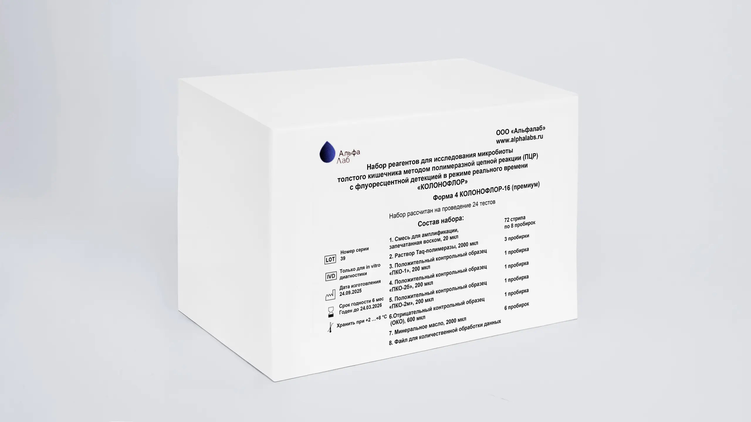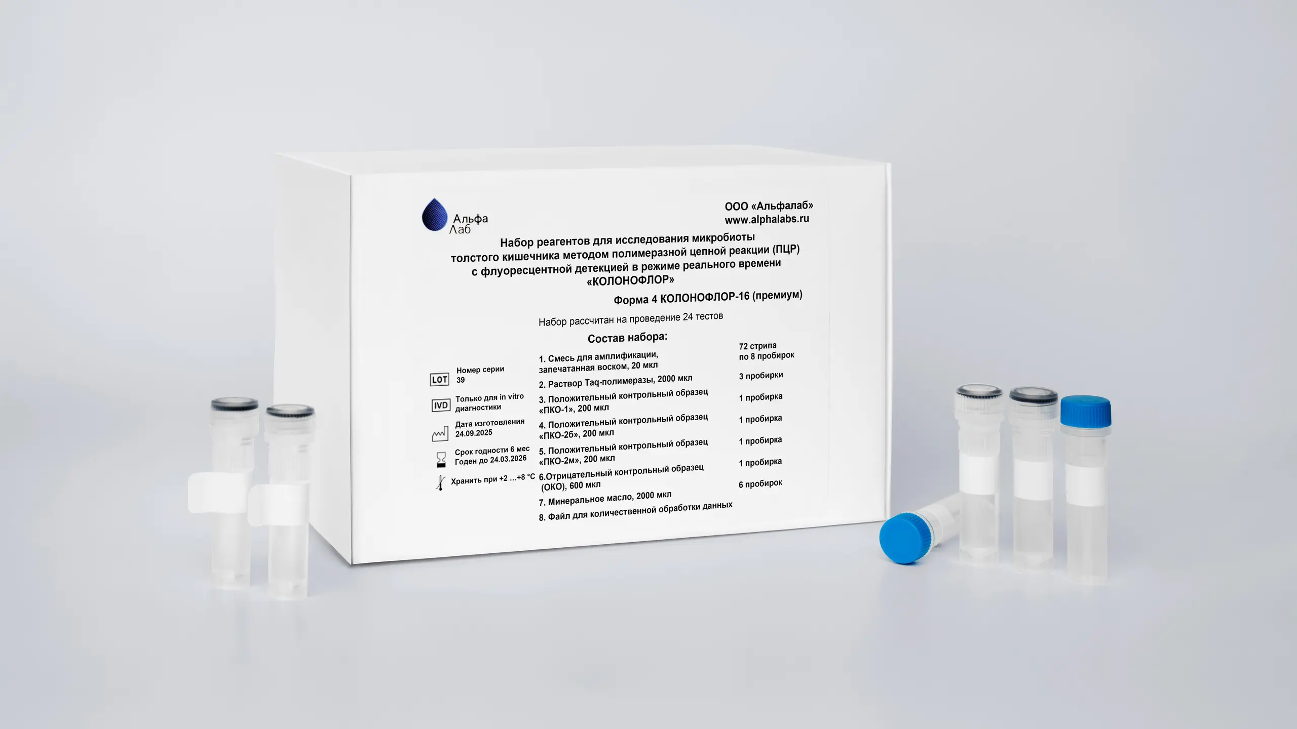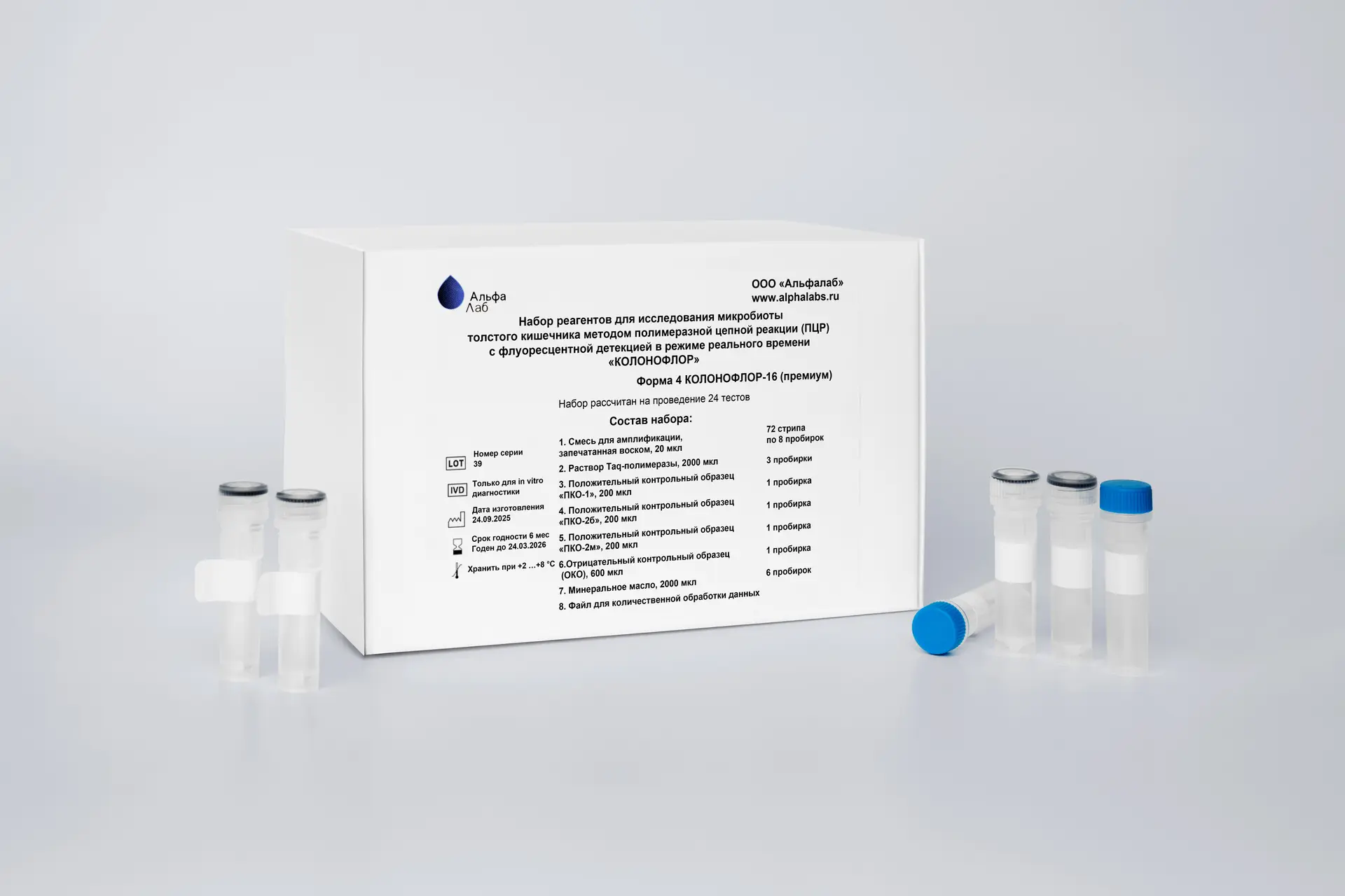 Форма «КОЛОНОФЛОР-16 (премиум)» рассчитана на проведение 24 тестов, включая исследование положительных и отрицательных контрольных образцов. Набор выявляет 32 показателя, включая 30 групп/видов микроорганизмов, общее бактериальное число и наличие генов патогенности, определяющих энтероинвазивные свойства E. coli.